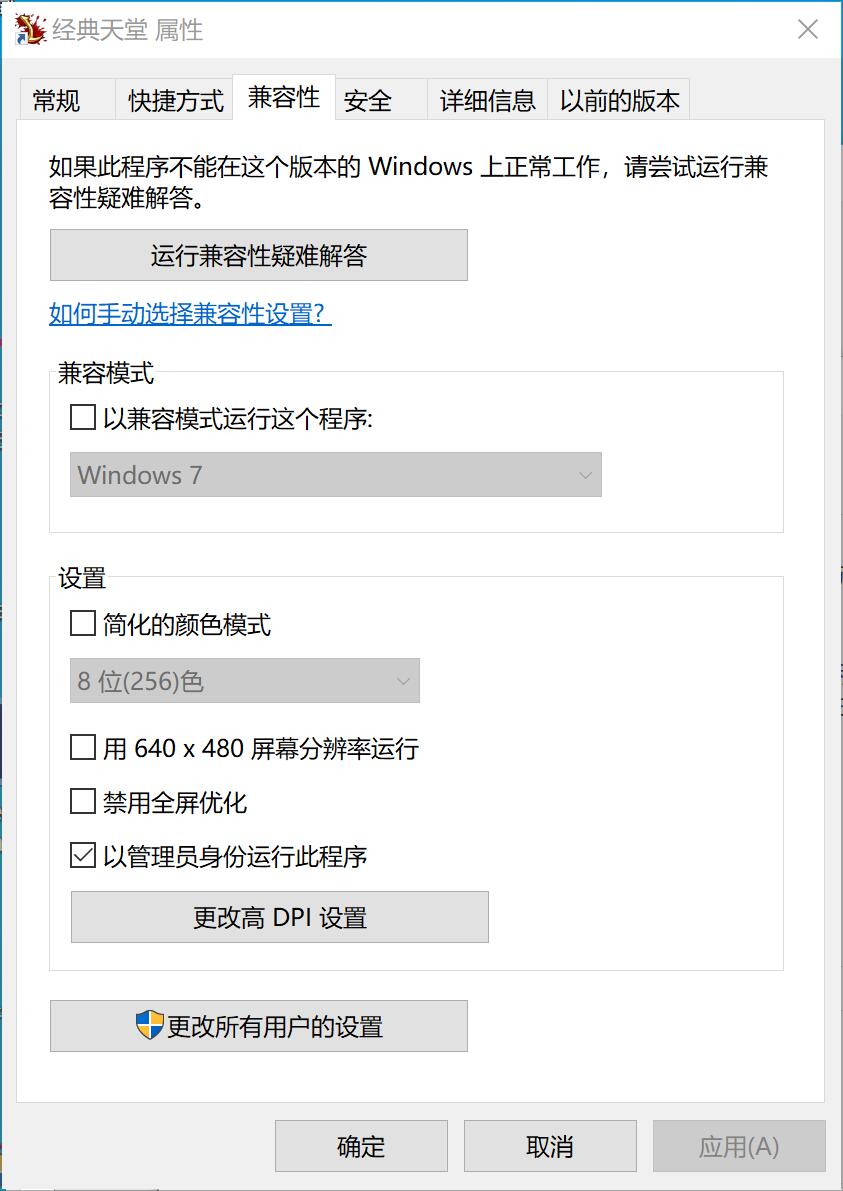 在图标上右键,然后选择菜单中的“属性” 并切换到“兼容性”选项卡