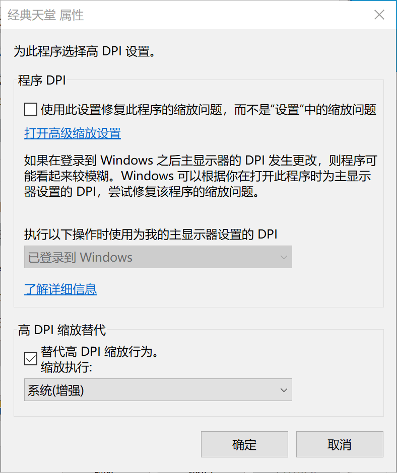 勾选替代高DPI缩放行为。缩放执行 选择"系统(增强)",如上图所示,然后点击确定。