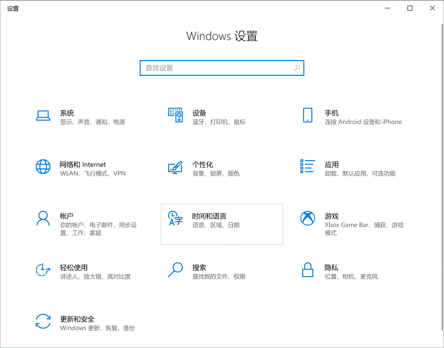 点击设置,在弹出的Windows设置窗口中找到时间和语言设置项,并将其打开;