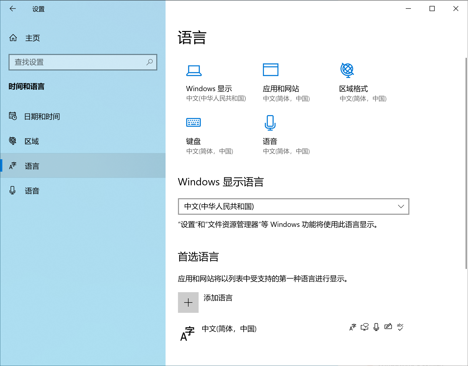 找到首选语言区域,点击“中文(简体,中国)”下的"选项"按钮;
