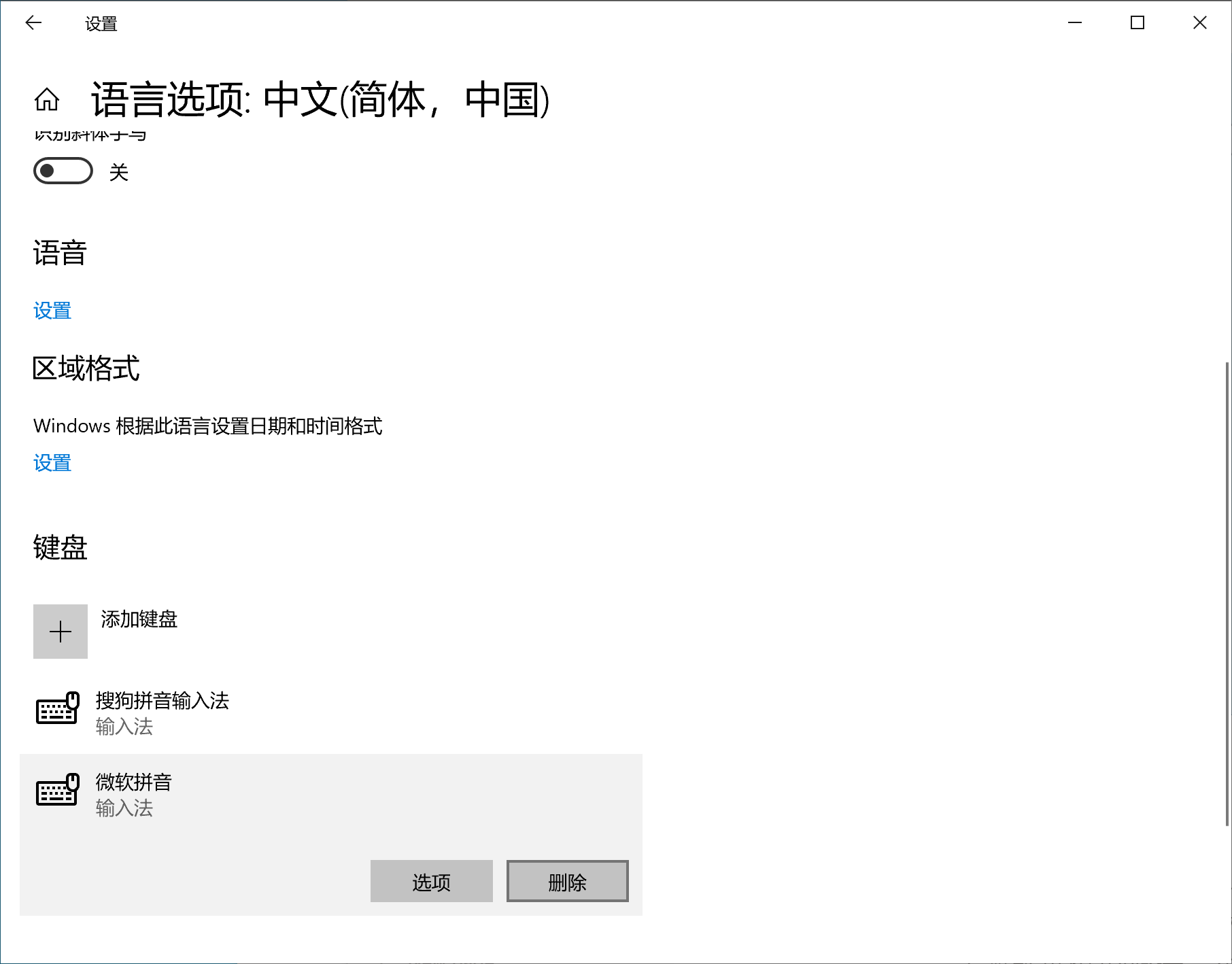 找到键盘区域,点击”微软拼音“下的"删除"按钮执行删除即可。