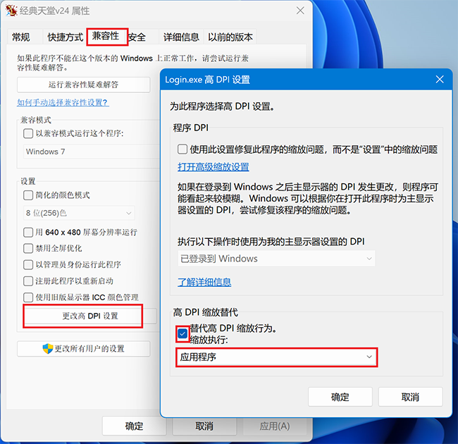 右键桌面上的游戏快捷方式图标 - 属性 - 兼容性 - 更改高DPI设置 - 勾选 替代高DPI缩放行为 并在下面列表里选择 应用程序